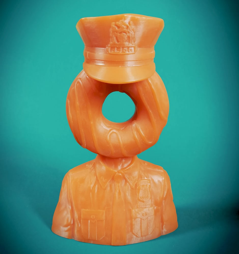 Based on the paintings of notorious Bristol artist Jimmer Willmott, a collab with digital sculptor Duncan Brown (also from Bristol) has brought Donut Cop into the 3d realm.